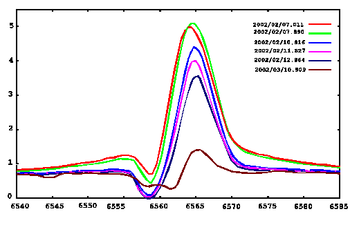 Bis Ende Februar nahm die Helligkeit bis auf 8.4mag ab, auch die H-Alpha-Intensität sank (siehe Abbildung 2). Die Breite des Profils stieg dagegen an, und es tauchten Absorbtionslinien auf, die die Existenz einer Staubhülle nahelegten.