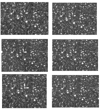 Abbildung: Stardialaufnahmen des Ausbruchs von V838 Mon am 2000/02/28, 2002/01/01, 2002/01/10, 2002/02/01, 2002/02/04 und 2002/03/05 (von oben links nach unten rechts). Die Originalbilder liegen unter [2] im Internet. Die Position des Sterns ist auf allen Bildern gekennzeichnet.