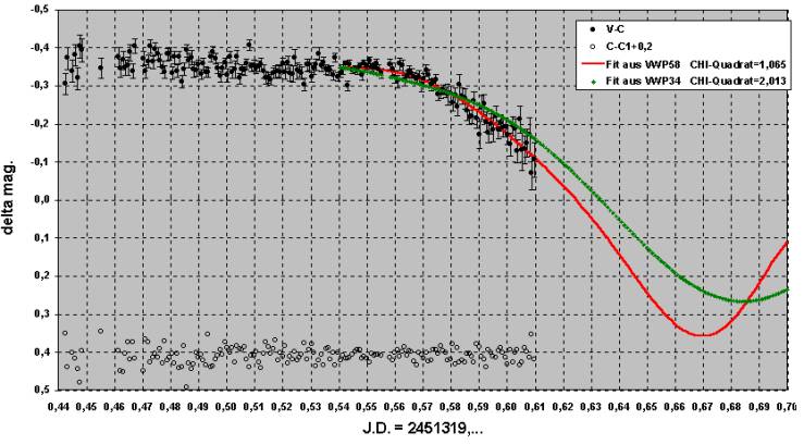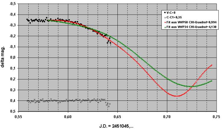 Man sieht, daß die beiden Perioden leicht voneinander abweichen. Die Differenz der Perioden ist aber lediglich 2,5 mal so groß, wie die Fehler-Summe der Periodenbestimmung. Ein größerer Unterschied der Perioden wäre ein signifikanter Hinweis auf eine langsame Apsidendrehung, die wir leider aber mit unserem Datenmaterial somit NOCH NICHT nachweisen konnten. Das müssen jetzt die nächsten Jahre (oder Jahrzehnte) ergeben.