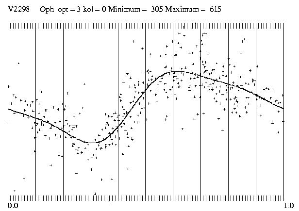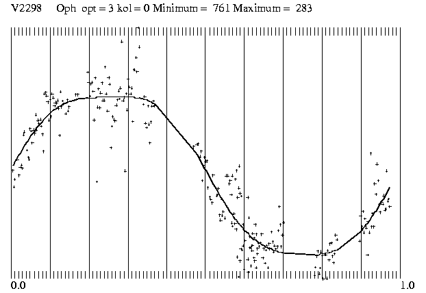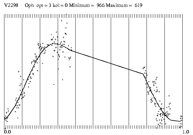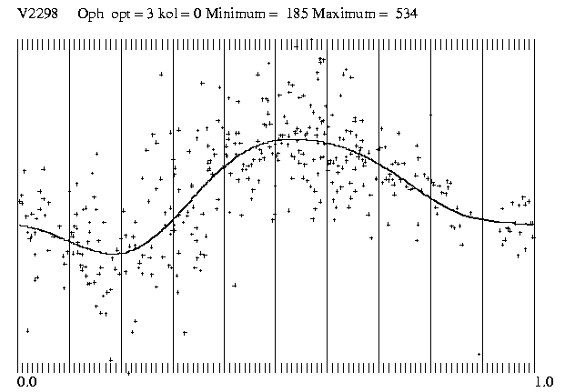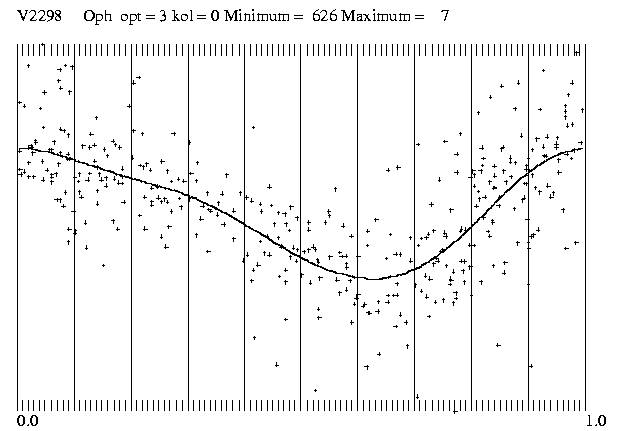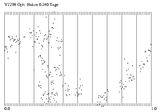 Im Juni und Juli 2003 war ich 20 Nächte auf Hakos-IAS und das war die Gelegenheit, all die alten Bekannten im Ophiuchus wieder einmal zu besuchen. Den V2298 Oph habe ich in der Nacht vom 1. auf den 2.Juli durchgehend beobachtet und am Abend des 3.Juli nochmals 45 Minuten lang. Die Beobachtungen wurden mit einem Celestron-14 und einer ST-7 mit rotem Filter gemacht.Da ich 2003 an die 10 000 CCD-Bilder aus Namibia mitgebracht habe, bin ich trozt der tatkräftigen Hilfe von Radek Dreveny in Znaim mit der Auswertung noch nicht fertig.